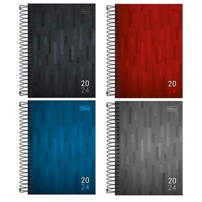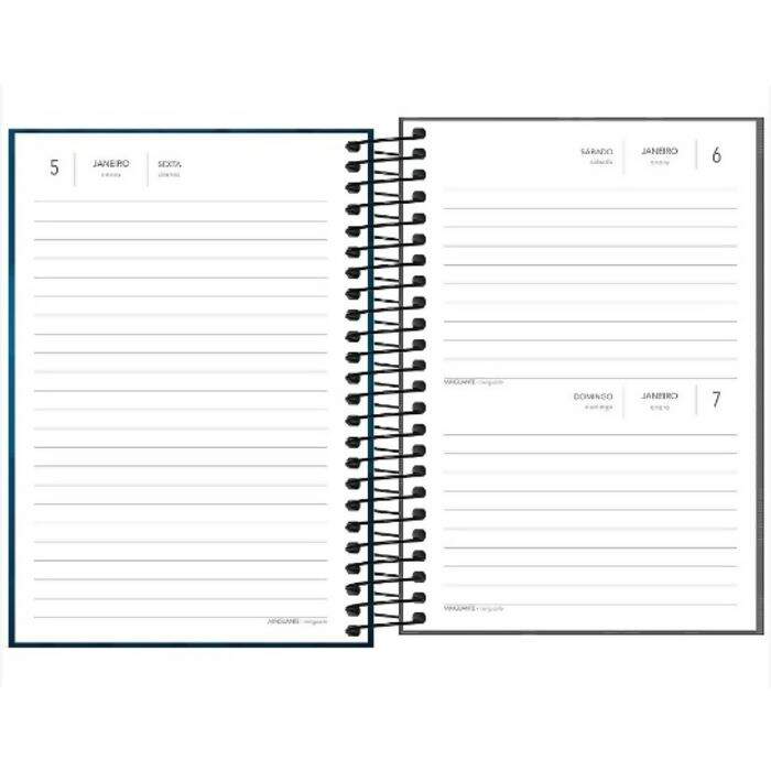 Agenda espiralada com visão de 1 dia por página, exceto sábado e domingo. Possui capa dura e bolsa plástica para guardar trabalhos e