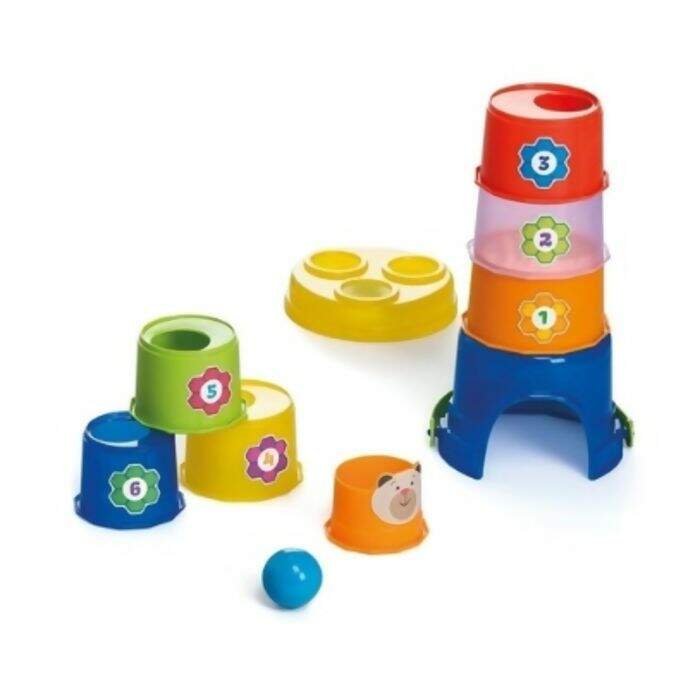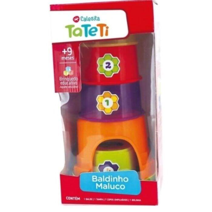 O Baldinho Maluco, vem com sete copinhos de empilhar e vira um divertido tobogã, para dar mais emoção à brincadeira. Acompanha uma bolinha que se desliza pelo tobogã passando por cada pecinha.
