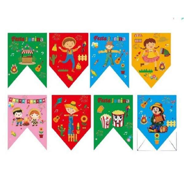 Bandeirolas coloridas com estampas de festa junina, ideal para decoração em festas juninas, julinas, agostinas, caipira, etc;