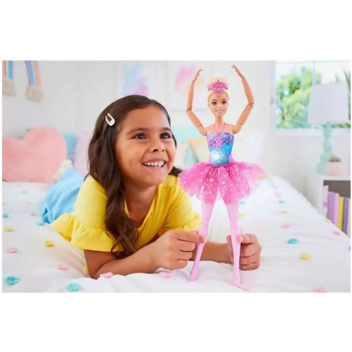 Tudo fica ainda mais mágico no balé! Veja as Barbie bailarinas brilharem e cintilarem ao dançar com seus detalhes de luzes.