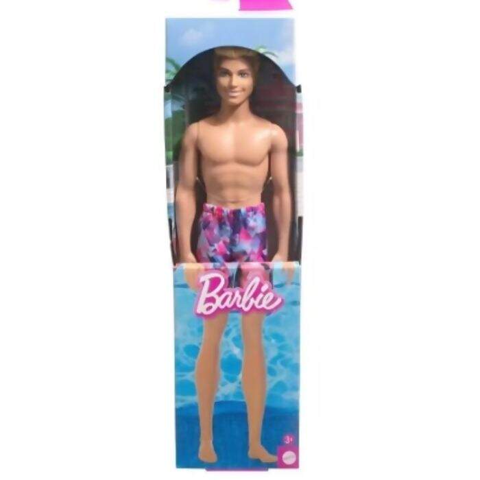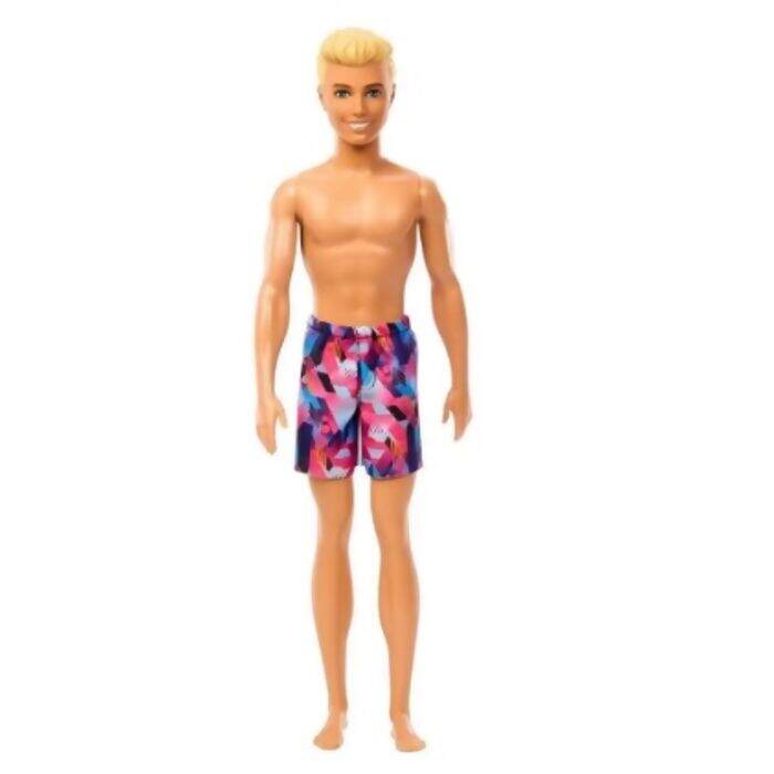 O boneco Ken veste calções de banho de tecido sun-sational com gráficos roxos incríveis.