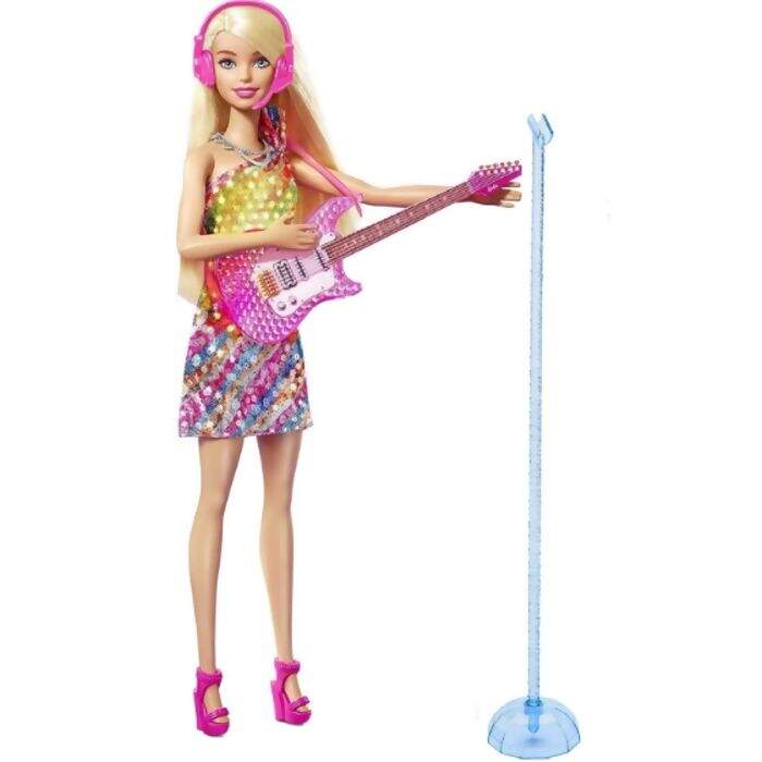 Faça momentos incríveis no palco com a boneca Barbie cantora! Quando as crianças levam o microfone da boneca Barbie à boca, a música toca, seu vestido se ilumina e ela cantará junto com uma das duas canções originais! Quando seu braço está de volta no lugar, a música continua tocando, mas a boneca Barbie para de cantar até que as crianças levantem o microfone novamente. A boneca Barbie usa vestido, colar e sapatos brilhantes. Ajude-a a se divertir com acessórios, incluindo guitarra, fone de ouvido, microfone com pedestal e muito mais!