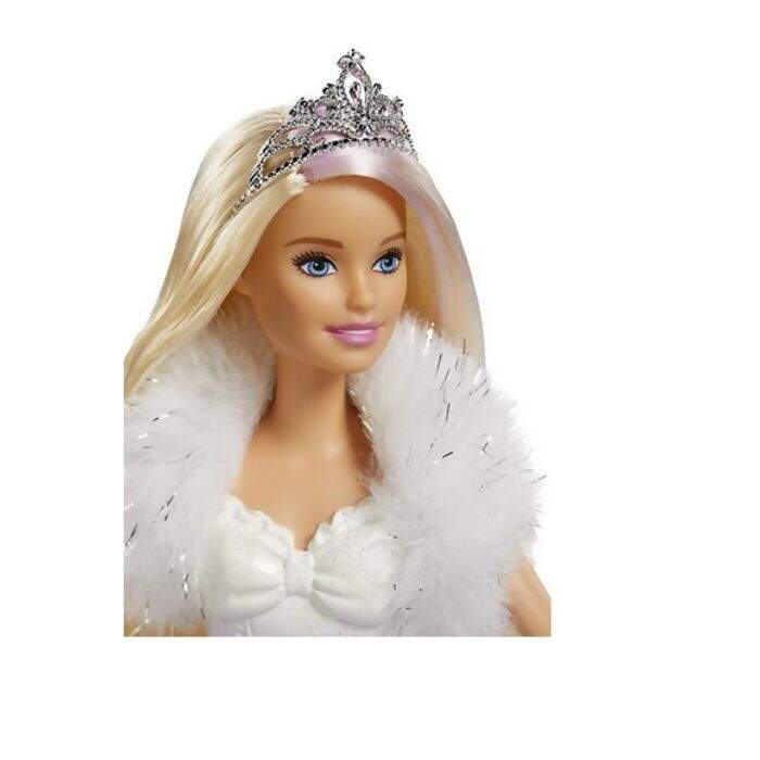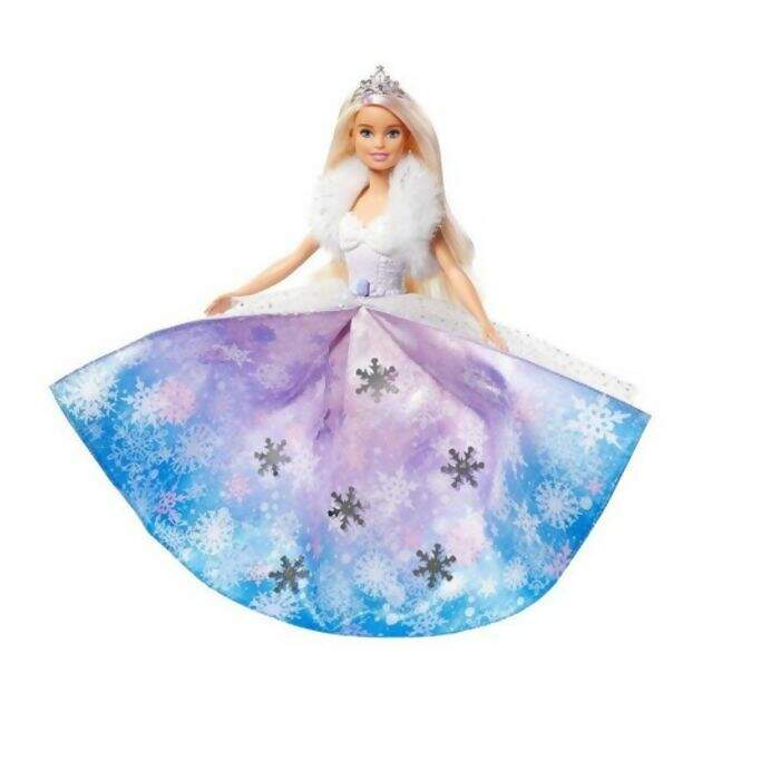 Esta boneca princesa está vestida para uma ocasião real em um vestido em camadas com estampa de floco de neve, cores geladas e muito brilho.