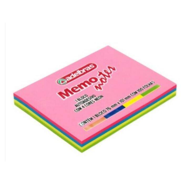 Bloco de Recado 4 Cores Neon Adesivo Memonote 76mm x 101mm 100fls Adelbras