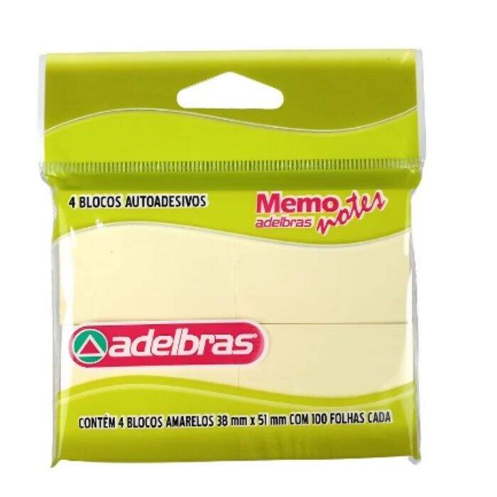 Bloco adesivo amarelo pequeno 38x51 com 4 unidades de 100 folhas Adelbras é um conjunto de blocos adesivos em formato retangular e de cor amarela.