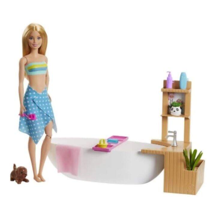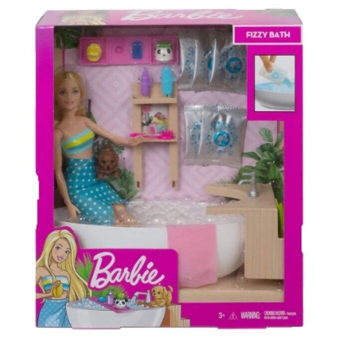 - As crianças podem praticar autocuidado enquanto ajudam a boneca Barbie a recarregar com este brinquedo com tema de spa que permite que elas brinquem com um momento clássico – um banho brilhante e efervescente.