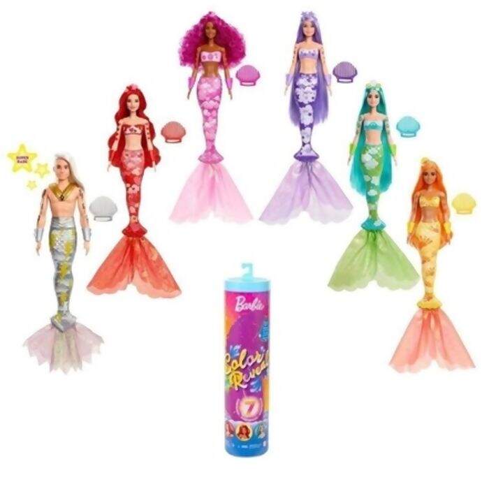A Barbie Color Reveal oferece uma experiência cheia de surpresas -- sete surpresas, exatamente! é certo que haverá uma cauda colorida de sereia, mas o visual de cada boneca é um mistério até ser revelado.