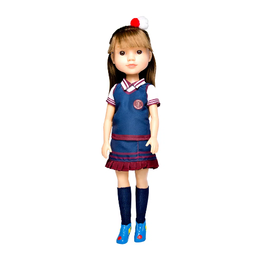 A boneca está caracterizada igualzinha a personagem da novela, inclusive com a roupinha, meias e sapatinho.