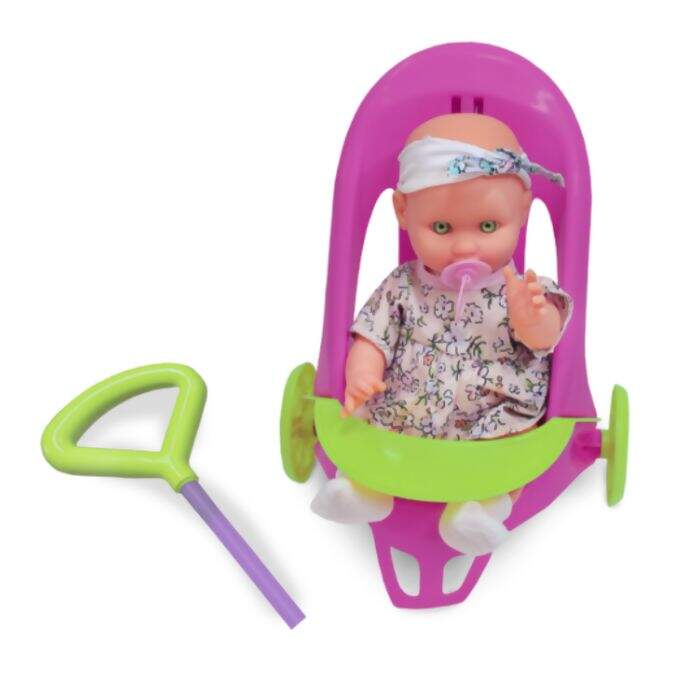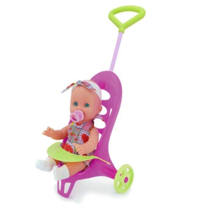 a Boneca Acompanha Um Carrinho com Haste e Uma Chupeta.