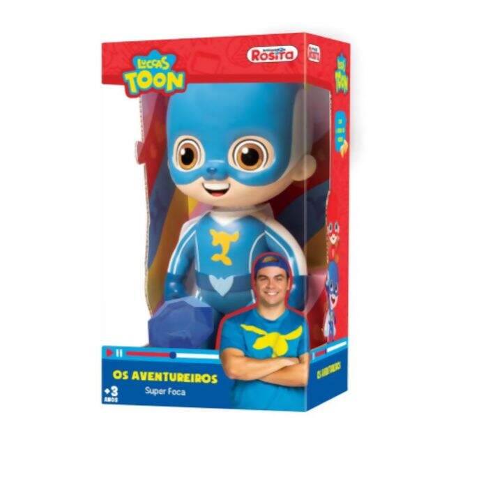 O Boneco Luccas Neto é o aventureiro azul, ele se transforma em herói, graças a incrível pedra do poder que o torna em Super Foca!