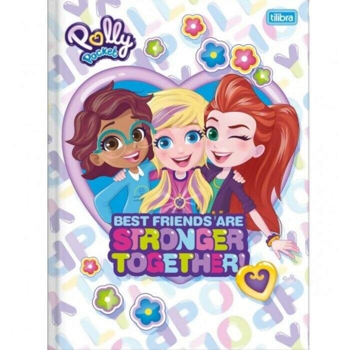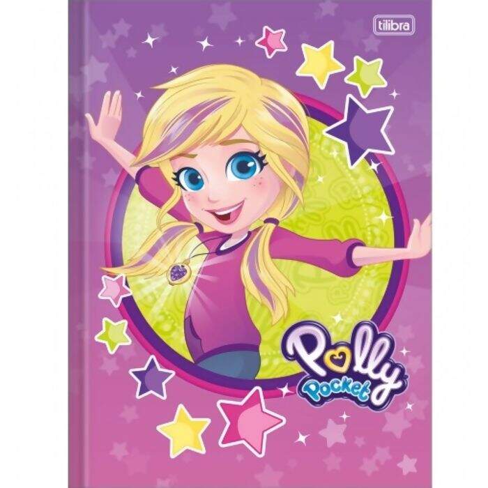 O Caderno Brochura Polly Pocket + Enchantimals possui capa dura com a parte interna decorada, folha de adesivos e folhas pautadas.