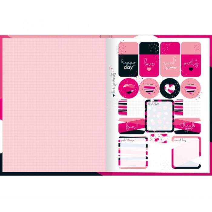 O Caderno Brochura Capa Dura Universitário Love Pink 80 Folhas possui capa dura com a parte interna decorada, folha dupla de adesivos e folhas pautadas.