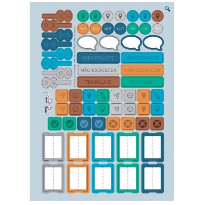 possui capa dura com a parte interna decorada, bolsa de papel para guardar trabalhos e anotações, folha com adesivos funcionais, folhas pautadas e espiral colorido.