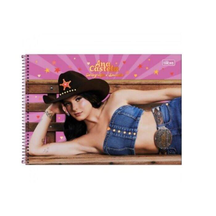 O caderno de desenho Tilibra tem capa dura com visual da cantora Ana Castela, espiral, folha de adesivos e 80 folhas brancas para liberar a imaginação.