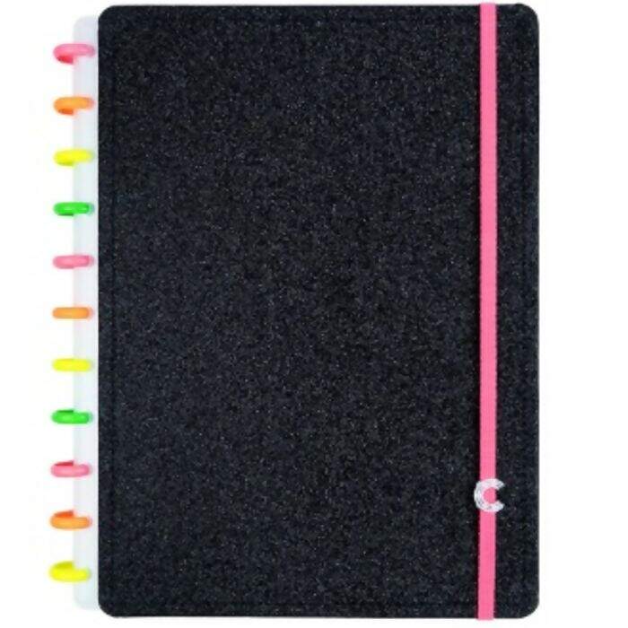 O novo Caderno Glitter Neon Black possui muito brilho na capa para você brilhar ainda mais nos estudos e anotações do dia a dia.