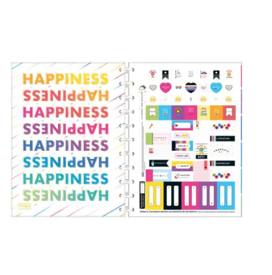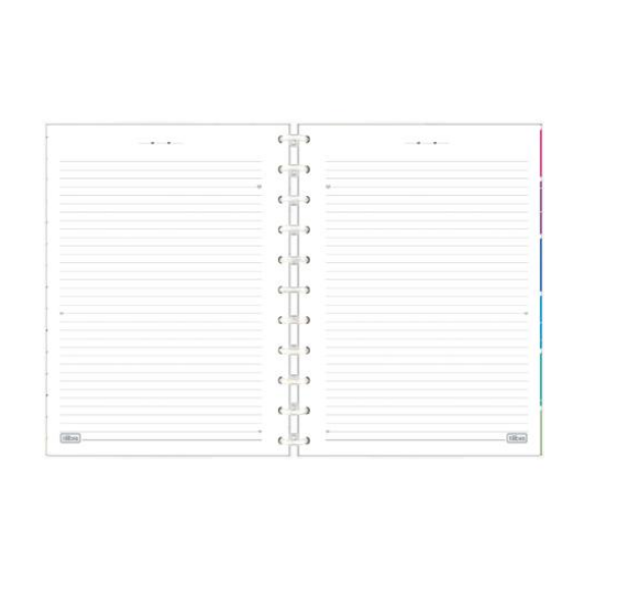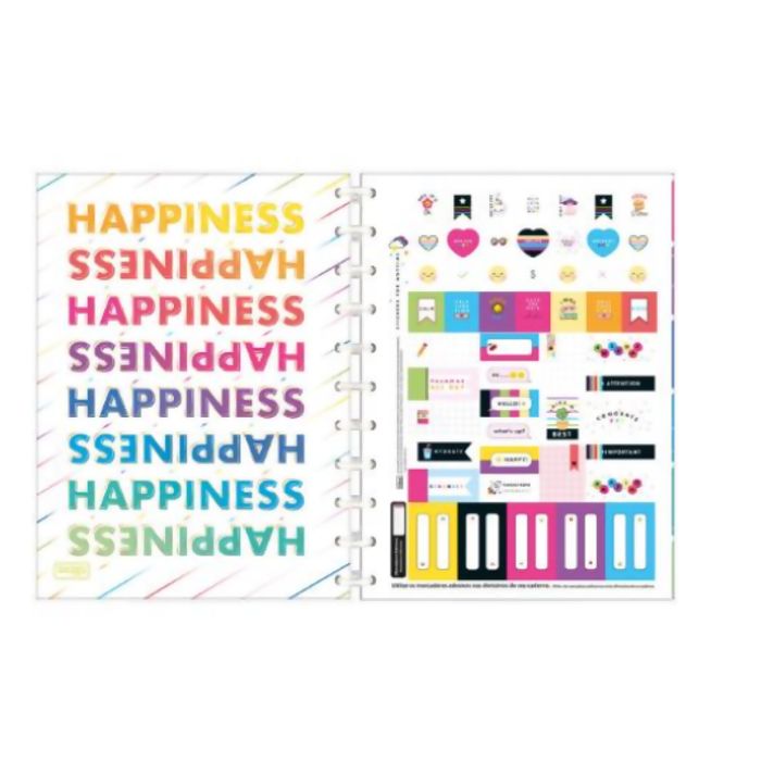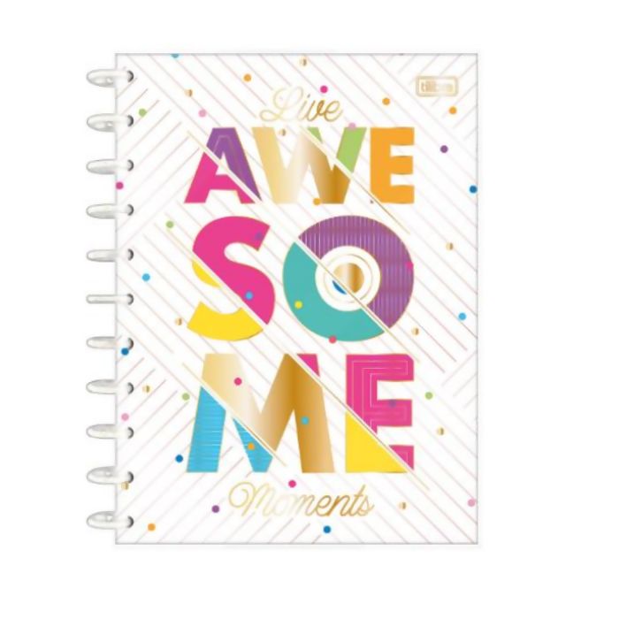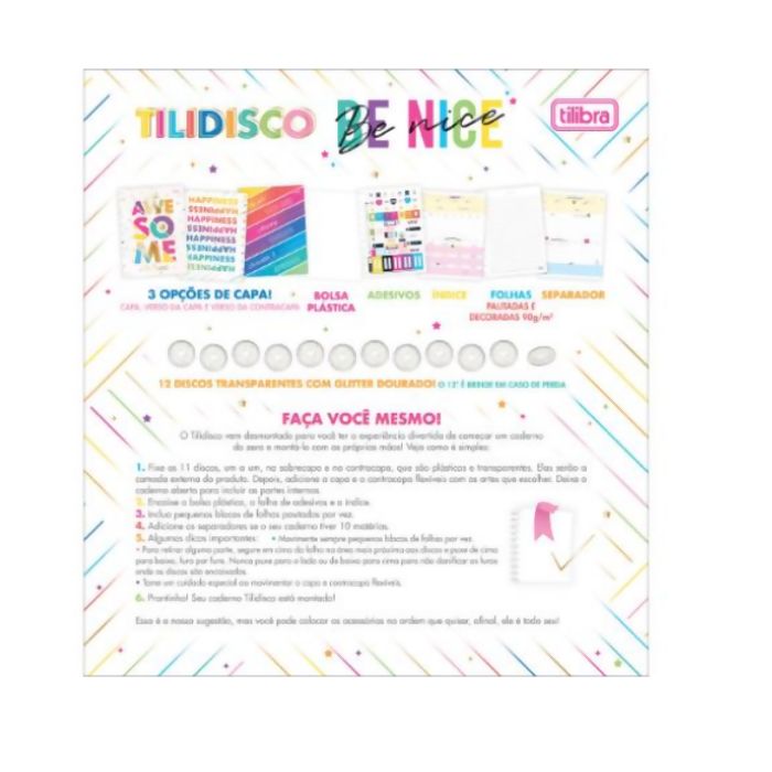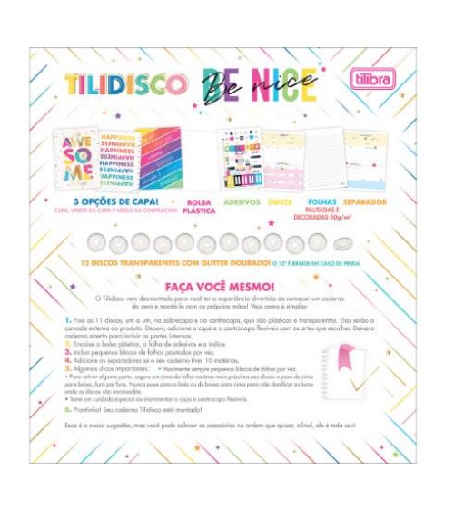 O Tilidisco também conta com índice decorado, bolsa plástica, adesivos, pacote com 12 discos, com 26 mm de diâmetro, transparentes com glitter dourado, sendo 1 de brinde para caso de perda, e folhas pautadas e decoradas, com gramatura de 90 g/m², para facilitar o encaixe dos discos e oferecer mais possibilidades para escrita com diversos tipos de canetas.