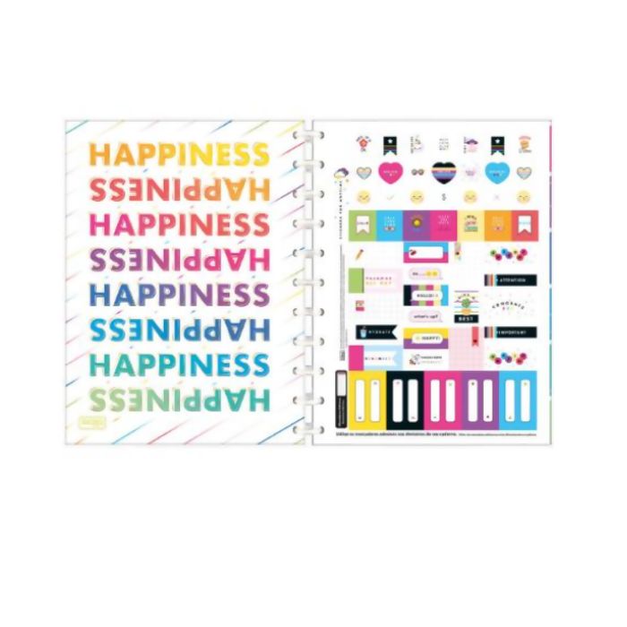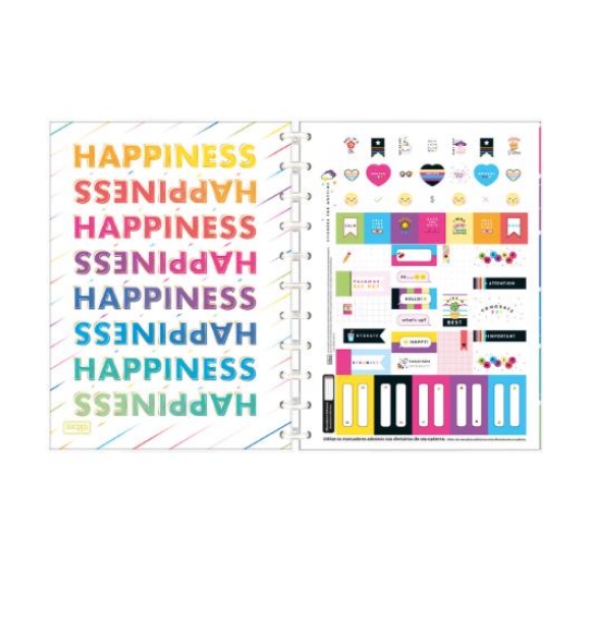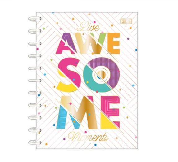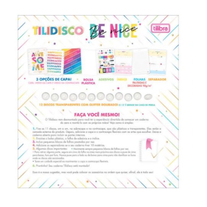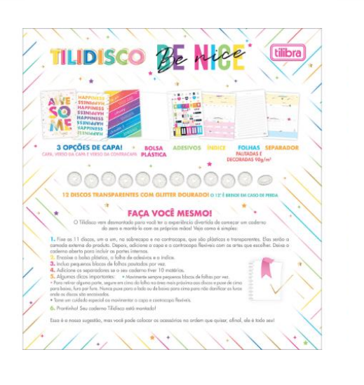 O Tilidisco também conta com índice e separador decorados, bolsa plástica, adesivos, pacote com 12 discos, com 33mm de diâmetro, transparentes com glitter dourado, sendo 1 de brinde para caso de perda, e folhas pautadas e decoradas, com gramatura de 90 g/m², para facilitar o encaixe dos discos e oferecer mais possibilidades para escrita com diversos tipos de canetas.