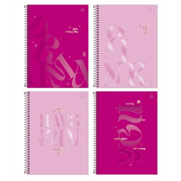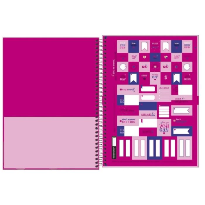 O Caderno Espiral Capa Dura Universitário 1 Matéria Love Pink 80 Folhas possui capa dura com detalhe metalizado, parte interna decorada, bolsa de papel decorada para guardar trabalhos e anotações, folha com adesivos funcionais, folhas pautadas decoradas e espiral colorido.