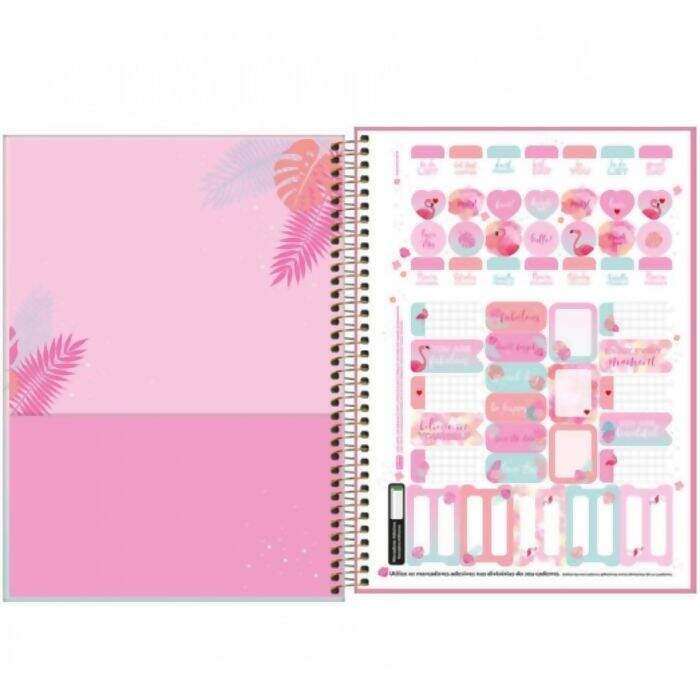 possui capa dura com a parte interna decorada, bolsa de papel decorada para guardar trabalhos e anotações, folha com adesivos funcionais, folhas pautadas decoradas e espiral colorido.