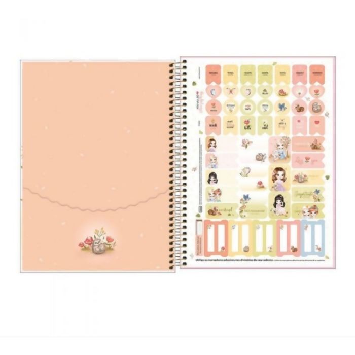 possui capa dura com a parte interna decorada, bolsa de papel decorada para guardar trabalhos e anotações, folha com adesivos funcionais, folhas pautadas decoradas e espiral colorido.