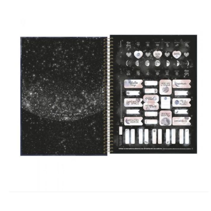 possui capa dura com a parte interna decorada, bolsa de papel decorada para guardar trabalhos e anotações, folha com adesivos funcionais, folhas pautadas decoradas e espiral colorido.