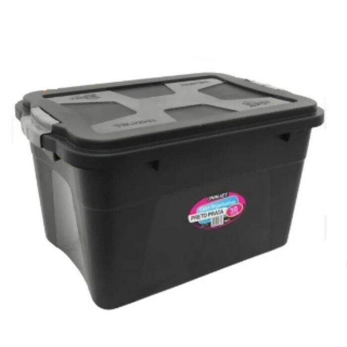 Contem: 1 Caixa organizadora com tampa e trava de 30 litros Preto.