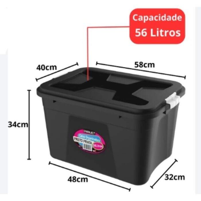 Contem: 1 Caixa organizadora com tampa e trava de 56 litros PRETO