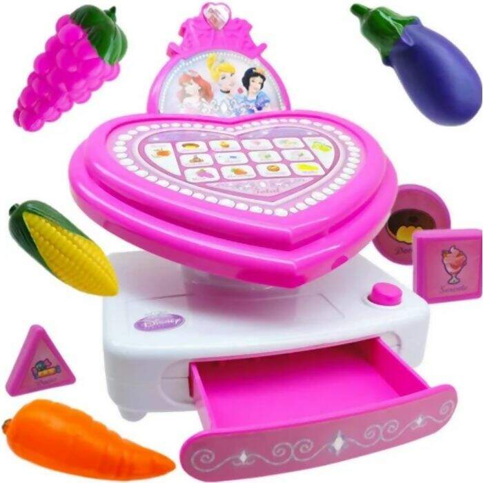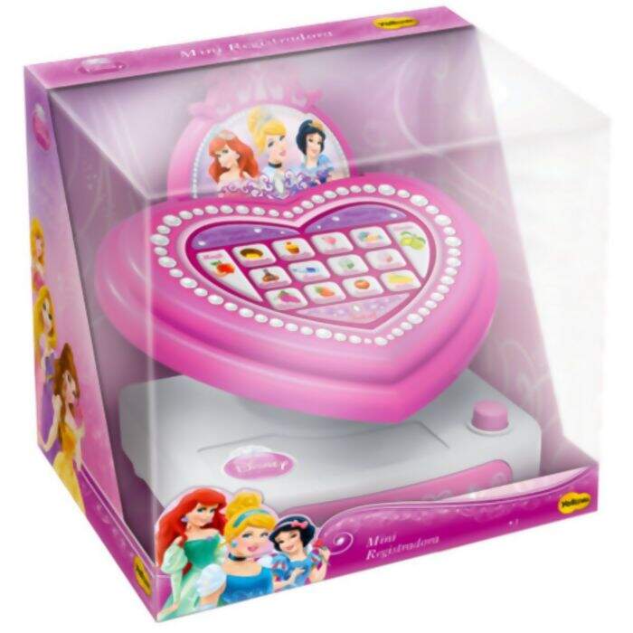 A Mini Smart Registradora das Princesas vem com gaveta abre e fecha, possui efeitos sonoros diferentes em cada tecla e também inclui mini produtos: três formas geométricas, dois vegetais e duas frutas pequenas.