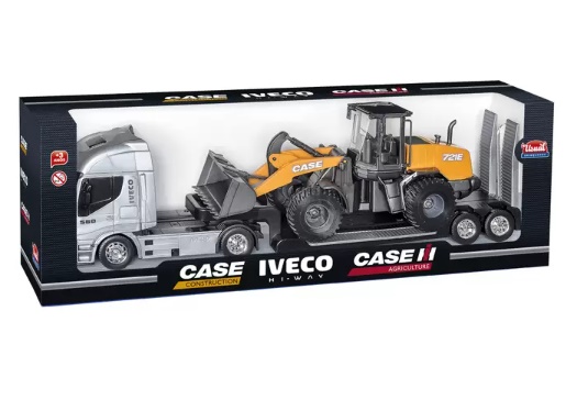 Com esse caminhão Iveco super divertido, a brincadeira vai ficar mais divertida e realista, acompanha trator pá carregadeira case construction, a carreta articulada com engate, com rampa para embarque e desembarque.