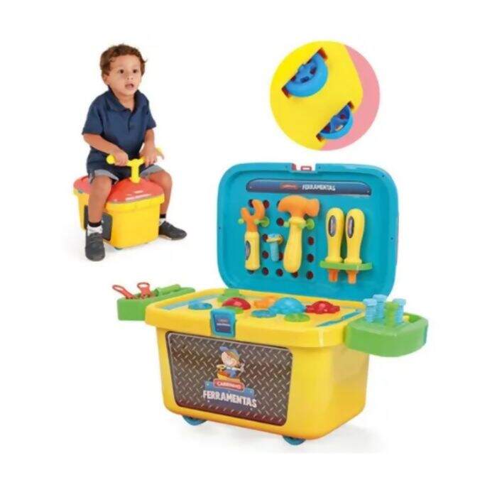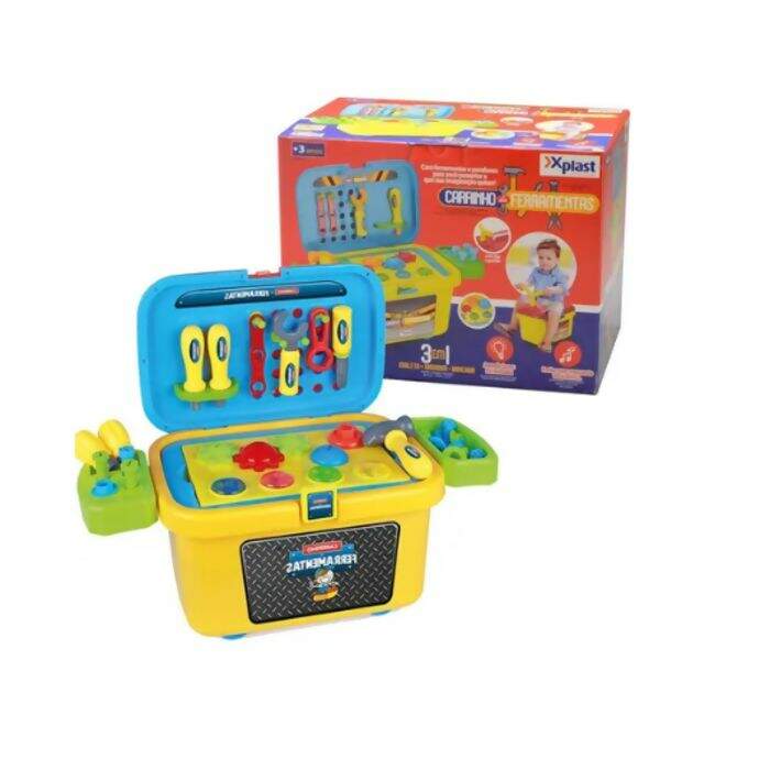 O Carrinho de Ferramentas da Xplast é um brinquedo com muitas funções! Além de ser uma maleta para guardar ferramentas, ele é também um mini andador e bancada! Emite sons, acende luzes, é super colorido e alegre, e as crianças vão se divertir muito aprendendo!