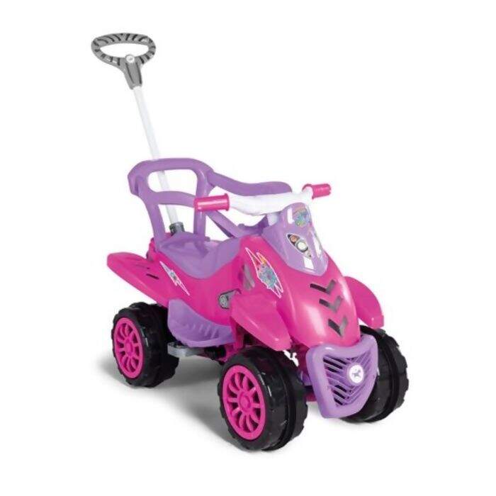 Um carrinho dois em um para passeio ou pedal. Vem com aro protetor, apoio de pés e empurrador para que os pequenos possam passear tranquilos com o papai ou a mamãe.