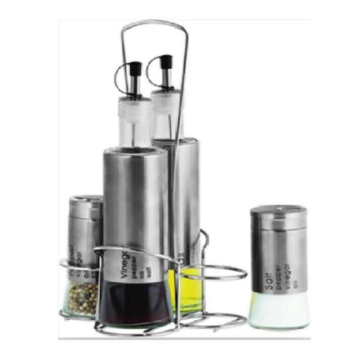 Galheteiro com porta condimento em vidro e Inox com suporte 5 pçs (2 porta tempero, 2 garrafas e 1 suporte)