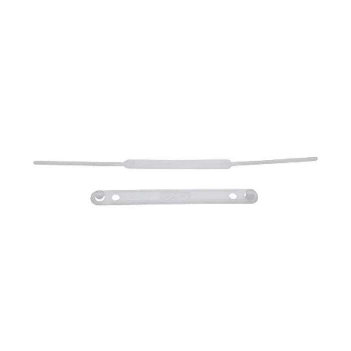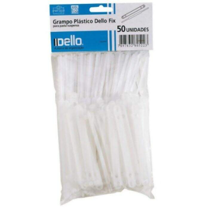 Grampo plástico injetado em polietileno com capacidade para armazenar aproximadamente 300 folhas (ref. Sulfite 75g/m²). Pacote com 50 unidades.