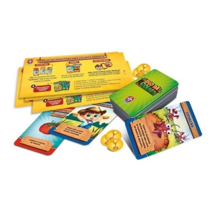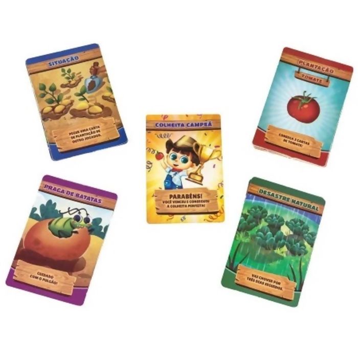 Contém: 4 cartelas; 20 Fichas Cartonadas; 60 Cartas de Plantação; 19 Cartas de Situação; 5 Cartas de Desastre Natural; 15 Cartas de Praga; 1 Carta de Colheita Campeã; 1 Manual de Instruções.