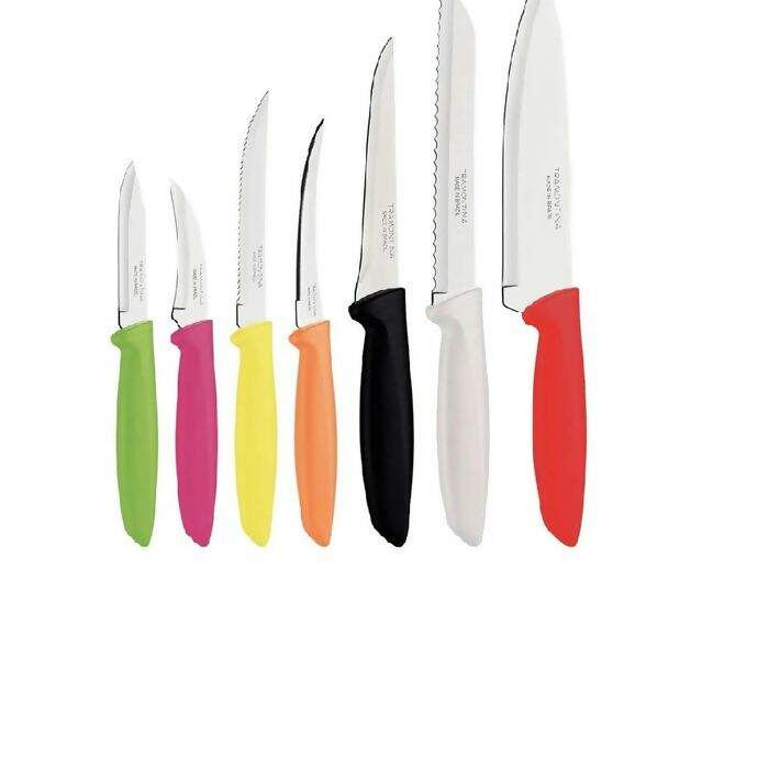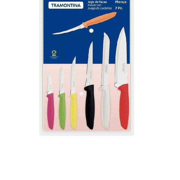 lâminas em aço inox e cabos de polipropileno colorido 07 peças é a escolha ideal. Composto por faca chef, faca para legumes, churrasco e frutas, pão,