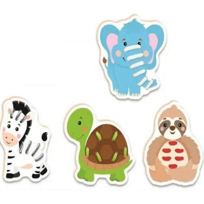 Caixa com 6 animais em madeira para criança praticar o alinhavo, passando o cadarço colorido no furinho das peças