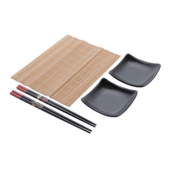 Contem: 02 molheiras de cerâmica 10x3 cm, 02 pares de hashi, 02 esteiras de bambu 25x20 cm.