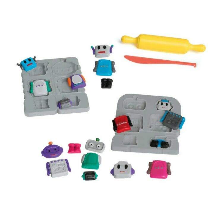 Com as 2 formas, os baixinhos poderão criar muitas variedades de robôs com massinha, juntando cabeça, corpo e pernas diferentes!