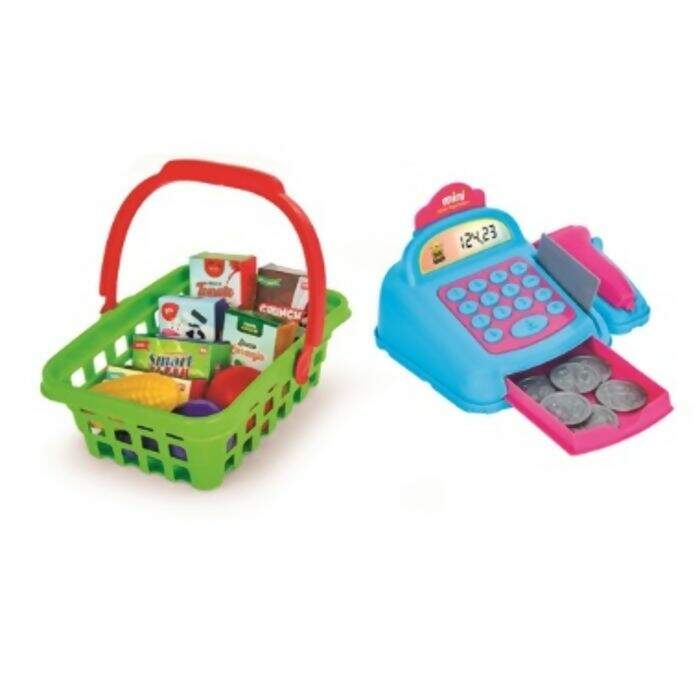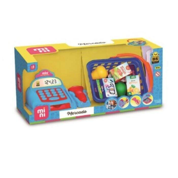 O mini mercado acompanha uma mini caixa registradora com gavetinha que abre de verdade para guardar as moedas e uma cestinha com os produtos para serem "bipados".