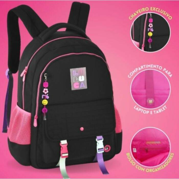 Com zíper logado que garante segurança e estilo adicional, a Mochila Luluca também acompanha um chaveiro exclusivo, tornando-a ainda mais especial.