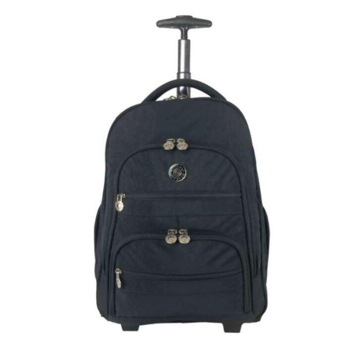ergonômico, com duas rodas fixas, apoio de pés. Na parte interna amplo espaço, compartimento para notebook e tablet, bolsos para pequenos