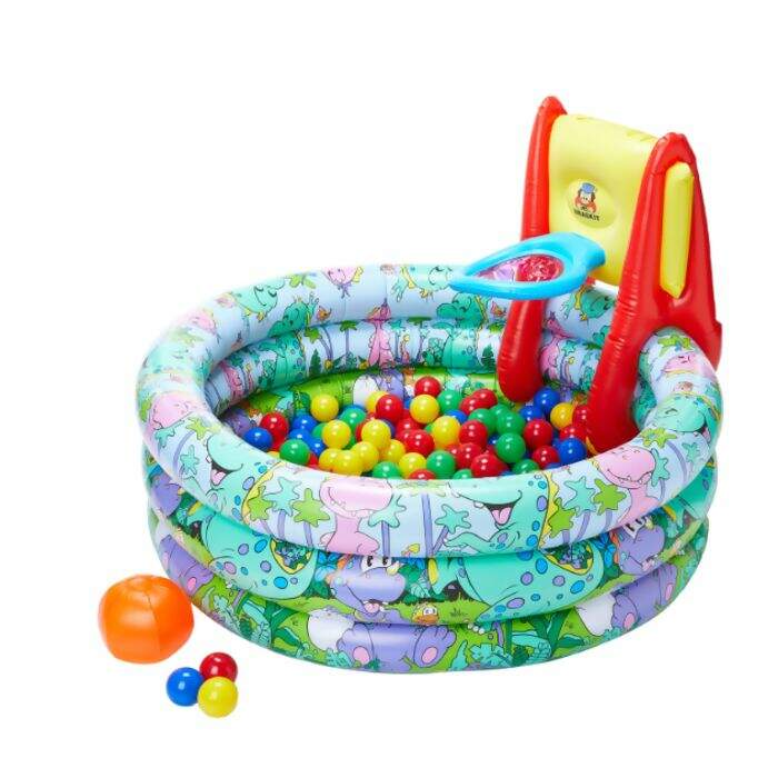 Contém: 1 piscina de bolinhas estampada 1 tabela de basquete 1 bomba de ar 1 bola inflável 150 bolinhas coloridas "Não recomendável usar água."