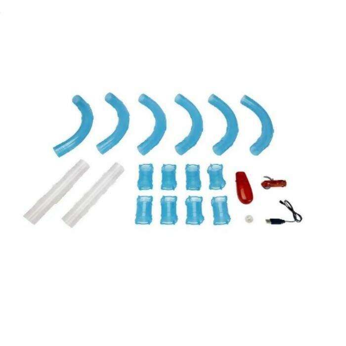 Contém 1 controle remoto, 1 carrinho, 1 esfera luminosa, 1 cabo USB, 8 curvas, 12 conectores, 3 retas longas com abertura e 1 manual com instruções.