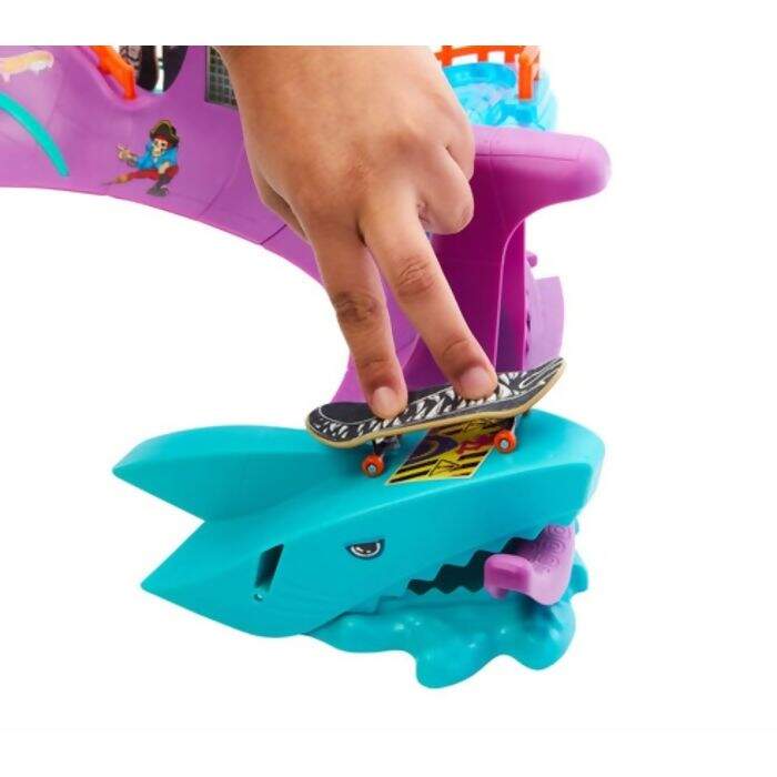 Inclui 1 conjunto de skate Hot Wheels Skate™ Octopark com 1 escala exclusiva e 1 par de tênis de skate removíveis.