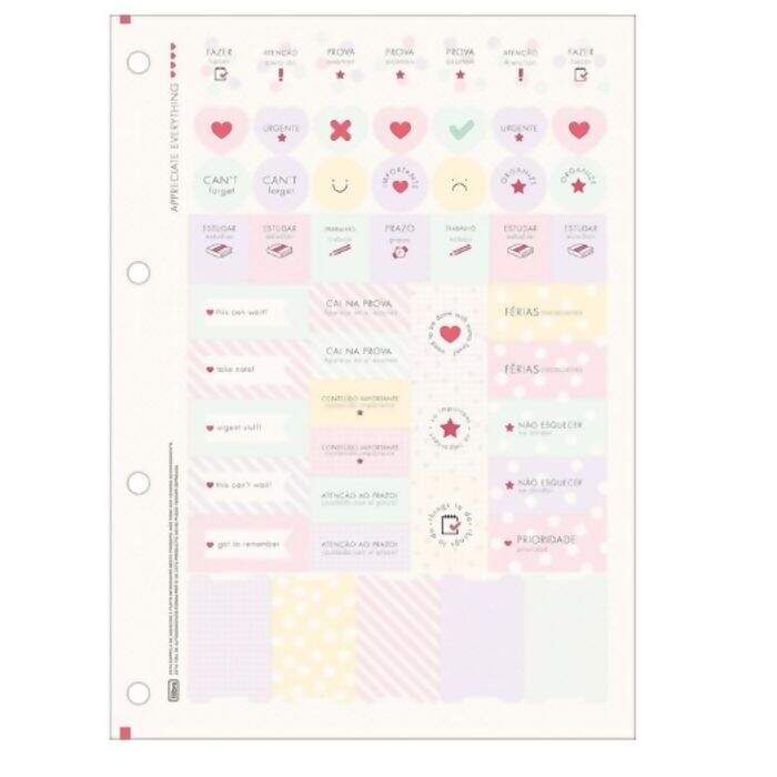 Este refil, em tamanho universitário, vem em embalagem com adesivos e 80 folhas pautadas e decoradas, que vão ajudar a organizar e deixar seus textos cheios de estilo.