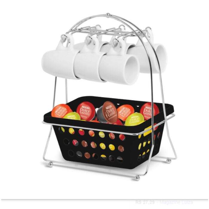 O suporte possui 6 ganchos para pendurar xícaras, e além disso, vem com uma linda cestinha para colocar as cápsulas de café.