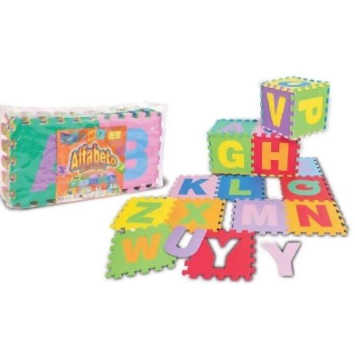 Alfabeto completo com 26 letras, incluindo “k”, “y” e “w”. composto de placas de e.v.a. colorido medindo 33 x 33 e 8 mm de espessura.