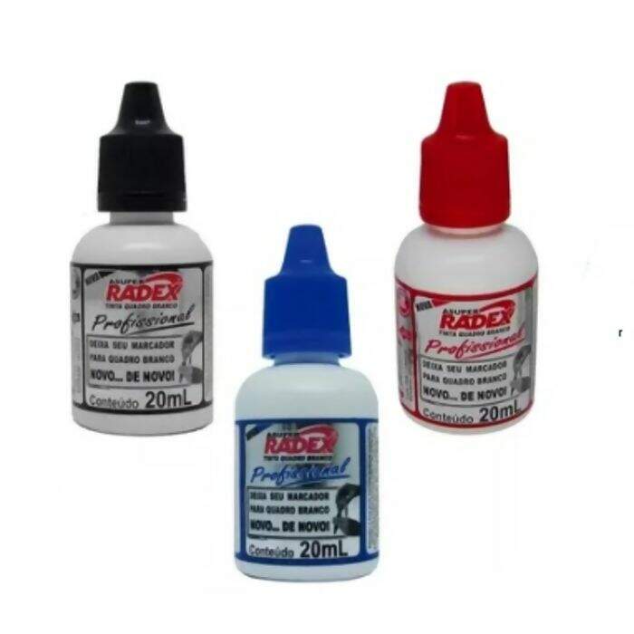 A Tinta para Marcador de Quadro Branco Radex 20ml é uma solução prática para recarregar marcadores de quadro branco.