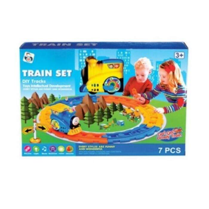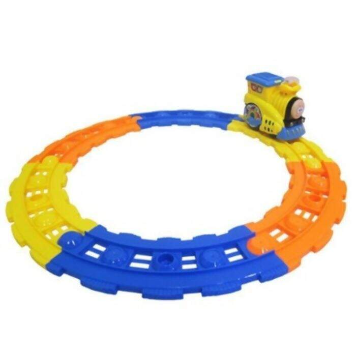 Os trilhos montados formam um circulo de 41 centímetros de diâmetro e a locomotiva tem luz e som.