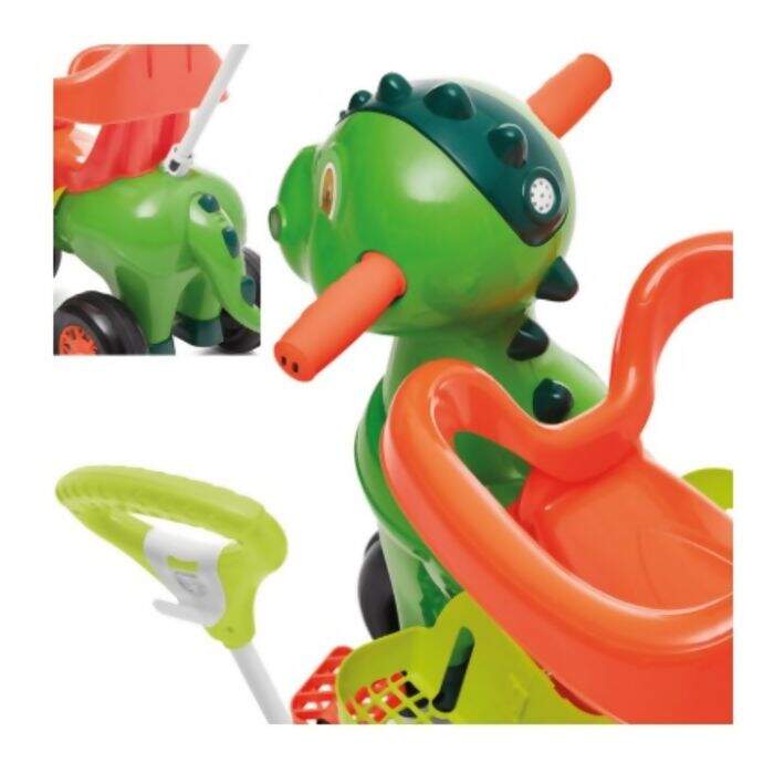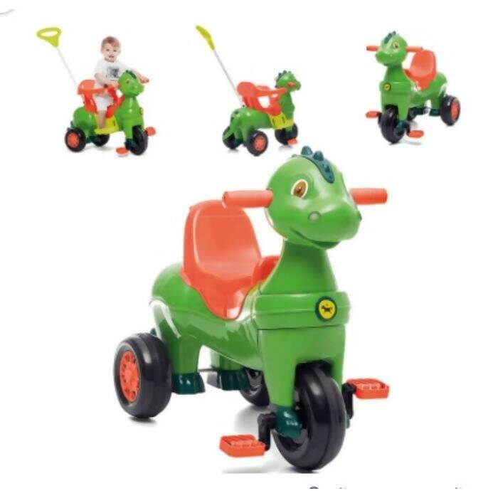 O triciclo 2 em 1, para passeio e pedal que faz sucesso entre os pequeninos. Com design de dinossauro, ele cativa pelos detalhes que encantam, como a crista e o som que imita um dinossauro! Na fase inicial do passeio, o apoio de pés mantém as perninhas do bebê confortavelmente apoiadas, e, a estabilidade do corpo é garantida pelo cercado de proteção, também removível.